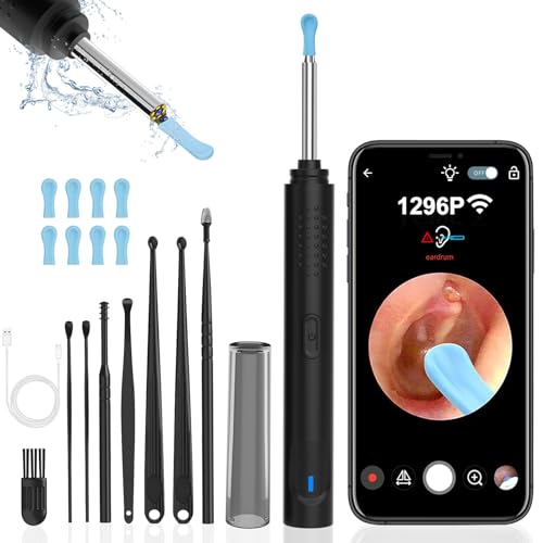 Ear Wax Removal, Ear Cleaner with Camera with 1296P, Earwax Removal kit with 9 Ear Pick and 8 Traditional Tools, Built-in WiFi IP67 Waterproof, Ear Cleaning Kit for iPhone,iPad,Android (Black)