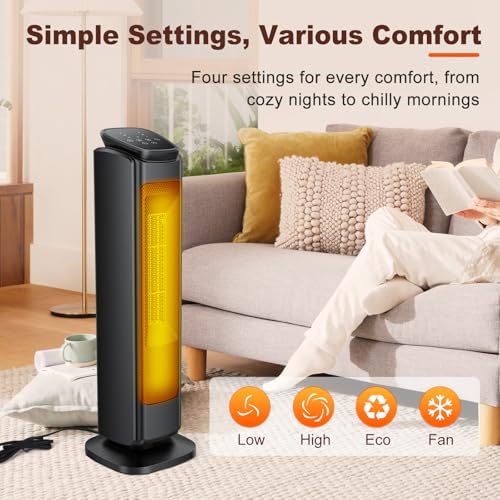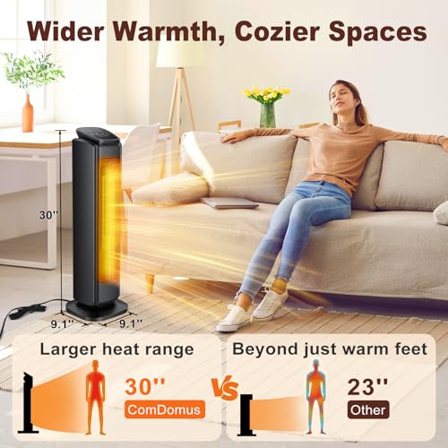 Wide-Reaching Warmth: The 30-inch tall tower design and oscillation feature distribute heat evenly throughout the room, eliminating cold spots