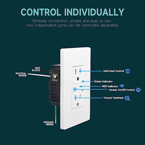 Specification: 2Pack Smart Wall Outlet, Electrical in-Wall Outlet with Individually Controlled, 15A Tamper Resistant Receptacle, Work with Google Home & Alexa, White, ETL&FCC Certified, 2.4G WiFi Only