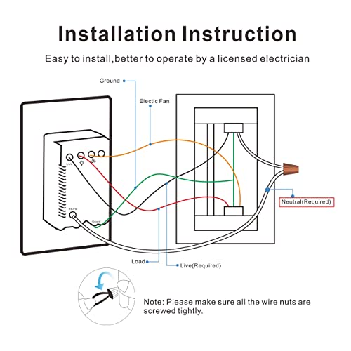 [INSTALLATION with NEWTRAL WIRE]: Easy to follow, step by step instructions will guide you through the wiring process. standard size; screwless Snap-On wall plate; no hub required. For 2.4G Wi-Fi only (NOT 5G). Max Power: 1250W. Output Current: 10A. FCC Certified. REMEMBER: EQUIRES NEUTRAL WIRE(White), LIVE WIRE(Red Or Black), BARE or GROUND WIRE(Green), and SEPARATE LOAD WIRE(2 wires) for FAN & LIGHT.