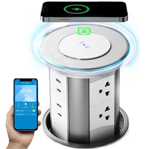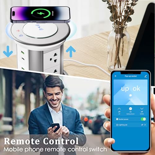 Specification: Pop up Outlet for Countertop with Mobile APP Remote Control,4.9″Space Saver Recessed Outlet,Pop Up Outlet with 15W Wireless Charger,Pop Up Electrical Outlet with 6 Outlets 4 USB Ports for Home Office