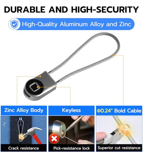 🔒【HIGH-SECURITY AND WIDE USE】: Long shackle cable lock adopts a high-density zinc alloy body and stainless steel bolt, which is durable and has superior cut resistance, and uses flexible steel wire to make sure be used in more places, such as Gate, Outside Fence, Gym, Locker, Cabinet, Refrigerator, Gun, Pool, and the like.