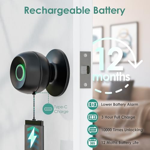 【Rechargeable Battery & Easy Installation】: Smart Door Knob built-in 400mAh rechargeable battery and with a Type C port for emergency use. It takes 3 hours, can be last up 12 months and be used for 10000 times door unlocking. Smart Fingerprint Door Lock fits most US door thickness 35 to 54mm, great for wooden doors, fire doors, security doors and very easy to install them with a screwdriver and with drilling a 25mm hole about minutes following the instruction