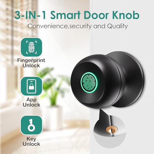 Fingerprint Door Lock,Smart Door Knob,Biometric Door Lock,Thumbprint Door Knob with APP Control, Key, Great for Bedroom, Front Door, Apartment, Office, Garage, Cloakroom Black