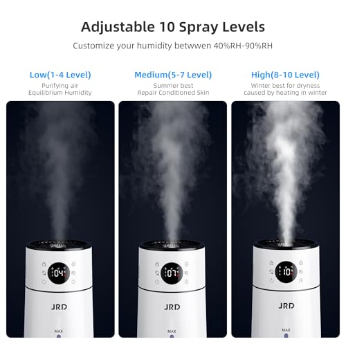 【Precise Humidity Setting】The Ultrasonic humidifier is equipped with a humidity sensor, you can set your preferred humidity level from 40%-90%, with the ability to adjust in 5% increments per touch. There are 10 mist volume modes, Low(1-4 Levels), Medium(5-7 Levels), High(8-10 Levels) ,can adapt to various room sizes and humidity requirements with ease. Note:The ideal indoor humidity range is 45%-60%