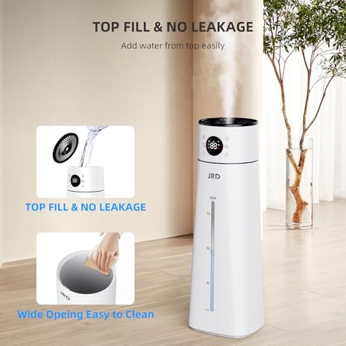 【Large Capacity & Top Filling Design】The humidifier features a detachable 8-liter (2.1-gallon) high-capacity water tank with top-fill design, eliminates leakage problem and simplifies the filling process. With a single fill, the humidifier can run continuously for up to 40 hours. 300 ml/hour of high humidity output can humidify up to 500 sq. ft. of area, relieving dry air and skin and helping you sleep comfortably without nasal congestion and coughing during the dry season or dry mouth