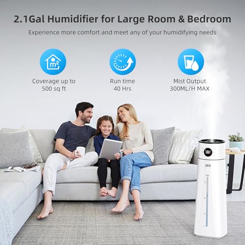 【Large Capacity & Top Filling Design】The humidifier features a detachable 8-liter (2.1-gallon) high-capacity water tank with top-fill design, eliminates leakage problem and simplifies the filling process. With a single fill, the humidifier can run frequently for up to 40 hours. 300 ml/hour of high humidity output can humidify up to 500 sq. ft. of area, relieving dry air and skin and helping you sleep comfortably without nasal congestion and coughing all over the dry season or dry mouth