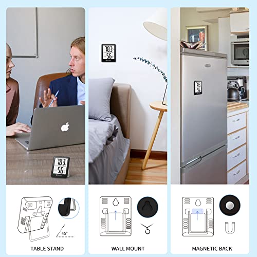 [Multiple Mounting Options]: The room thermometer indoor has 3 mounting options – Hanging Hole / Tabletop Stand / Magnet Attaching to be conveniently placed anywhere, such as baby room, kitchen, bedroom, greenhouse, reptiles terrarium, humidor, cellar, and incubator or other areas