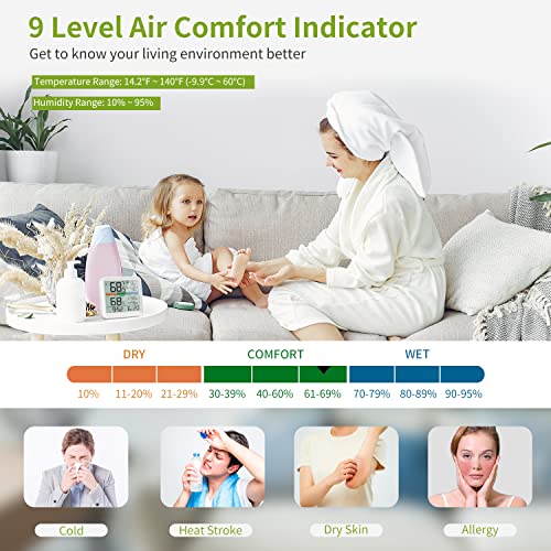 Specification: Indoor Thermometer Room Temperature Home Hygrometer Humidity Gauge, Accurate with Calibration, Backlight, Air Comfort Indicator, 24H Max Min Records, Time, Date (AAA Batteries Included)
