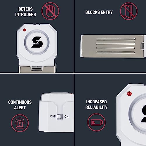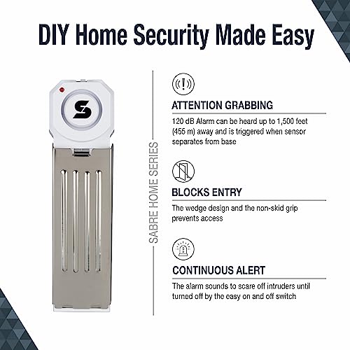 Specification: SABRE 120 dB Wedge Door Stop Security Alarm, Extremely Loud Wireless Alarm Siren Audible Up To 1,500 Ft., Non-Skid Pad, Compact Alarm Great for Home, Travel, Apartment or Dorm
