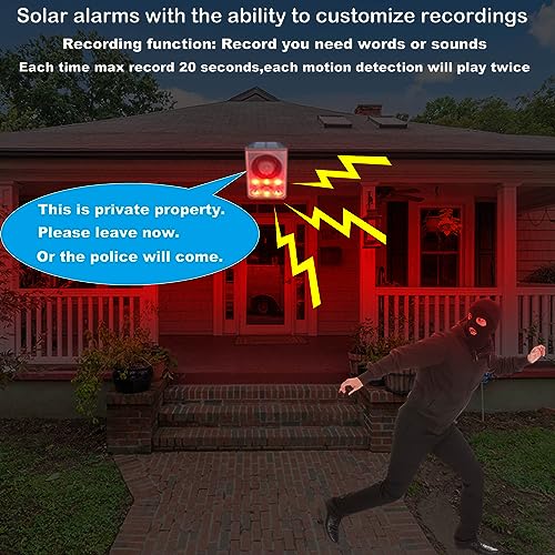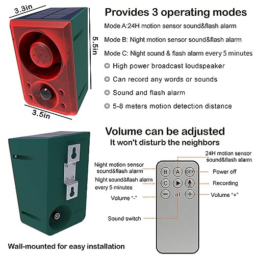 Specification: Solar Outdoor Motion Detector Alarm with 130dB Dog Barking & Gunshot Sounds, USB Charging & Strobe Light, Deter Intruders Effectively