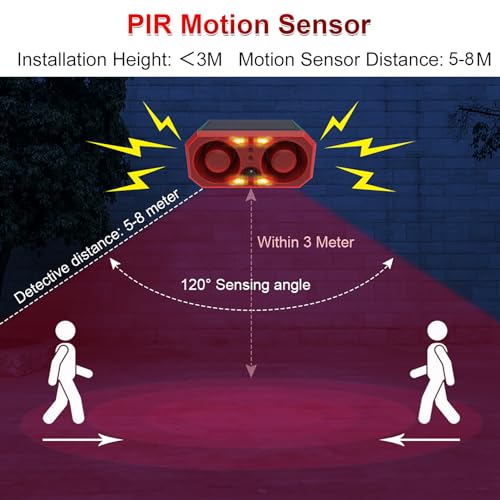 Specification: Solar Sound & Strobe Light Alarm Motion Sensor Siren, 13 Sounds & Recording, Dual Speaker 130dB Dog Barking Loud Noise Maker, Security Alert System for Home Farm Barn Villa Orchard (1 Pack)