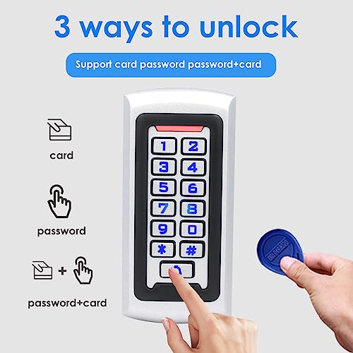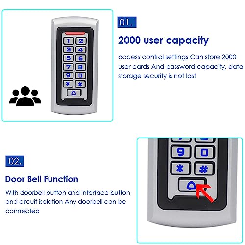 Specification: Waterproof Stand Alone Access Control Keypad,Metal RFID Card Reader,Door Access Control System Lock,Electric Gate Opener,Gate Lock,2000 User,Wiegand 26-bit,Proximity 125Khz RFID Card Keyfob