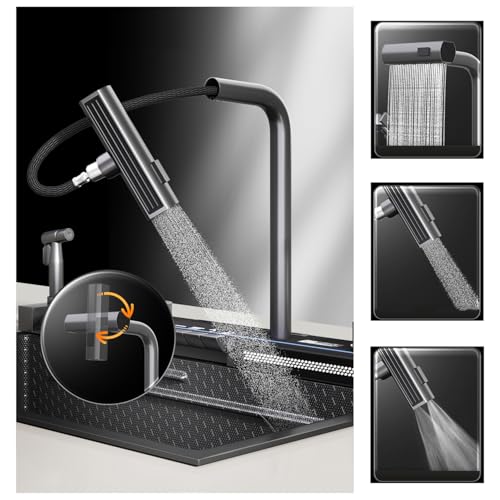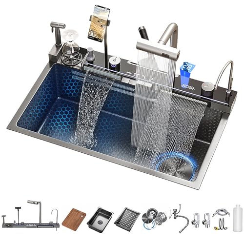 Specification: Modern Smart kitchen sink 304 Stainless Steel Single Bowl Kitchen Sinks,Digital Display Double Waterfall Sink, With Pull-out Swivel Faucet,With Cup Washer, Water Purification Faucet (29.5 x 18.1 inch)