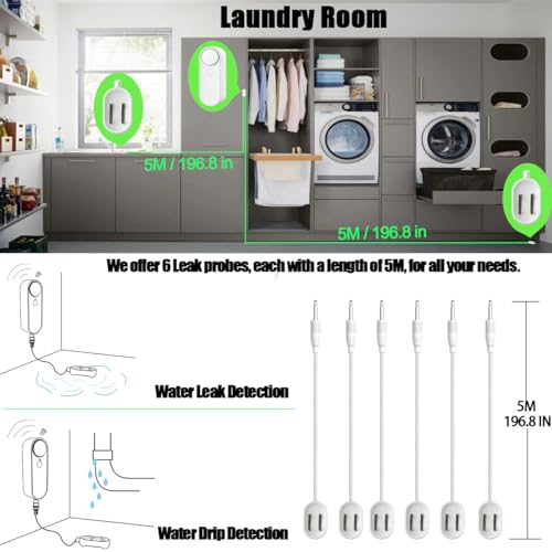 Specification: Upgrade WiFi Water Leak / Water Level 8 Sensor Probes, Smart Water Sensor Alarms, Detached 5 M Dual Detection Line, Left and Right Dual Alarms, Remote App Monitoring, Dual Alerts, AAA Battery Powered