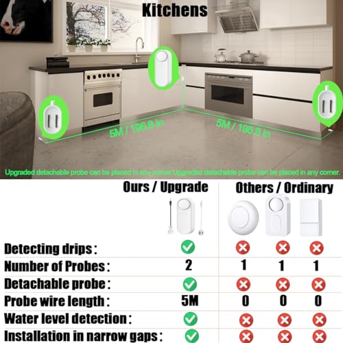 【More professional probes】- Compared with other vendors, our updated model of the set, taking into consideration the different water condition detection needs of different users, so we provide 8 probes (2 water level probes, 6 leakage probes), equivalent to the 8-pack products of other vendors, which can be customized for all scenarios.