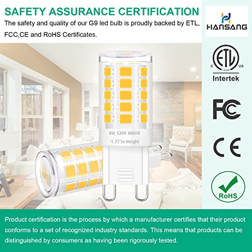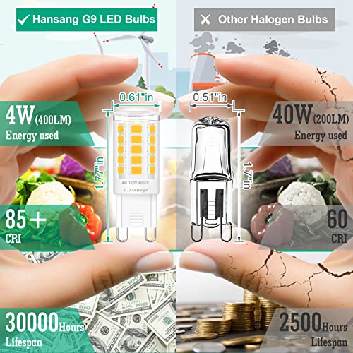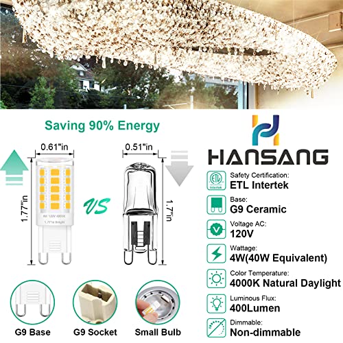 Specification: hansang 12 Pack G9 LED Bulb 4000K Natural Daylight, Height 1.77 inch 4W(40 Watt Halogen Equivalent) T4 Short Light Bulbs for Crystal Chandelier, G9 Ceramic Bin-pin Base, 400LM, AC 120V, Non-Dimmable