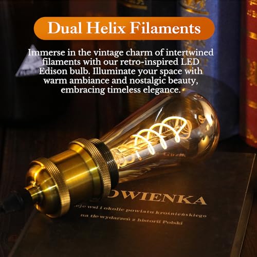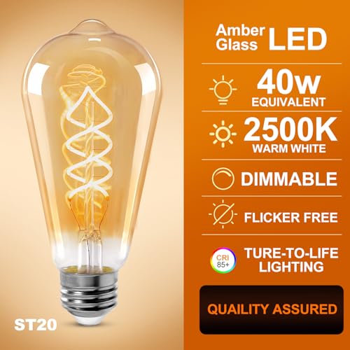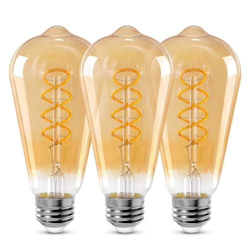 Specification: ST64 LED E26 Vintage Edison Light Bulbs, Amber Glass, Dimmable, 4W(40W Equivalent) 300 Lumin, 2500K Warm White, Spiral Filaments Design, Antique Style, 25000 Hrs, 3-Pack