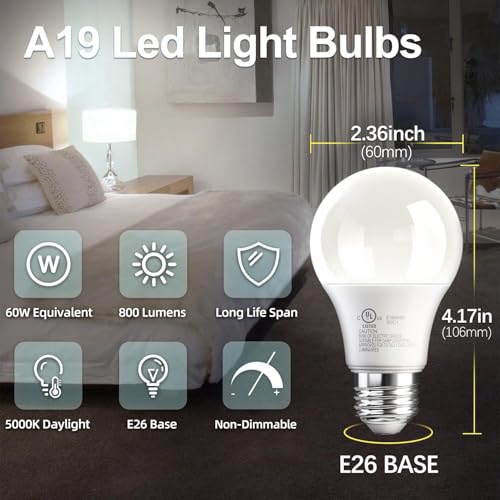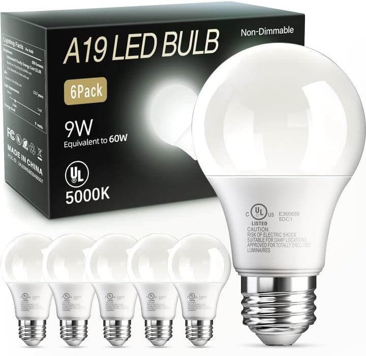 Specification: TJOY 6 Pack A19 LED Light Bulbs, 60 Watt Equivalent LED Bulb, Daylight 5000k, Efficient 9W, E26 Standard Base, Non Dimmable Energy Saving Light Bulb, 800LM, 80 CRI, 120V, UL Listed