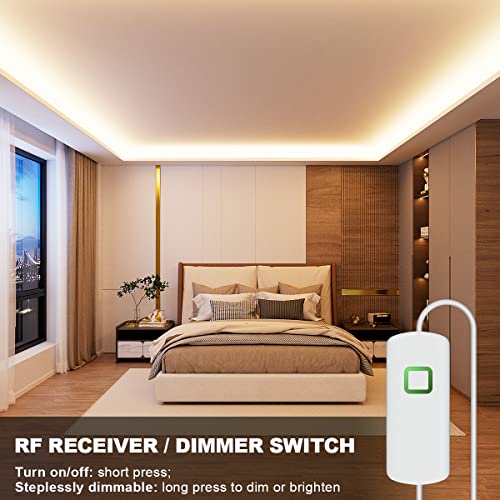 Dimmable: Rf remote controller is with 10 degrees brightness adjustment and 4 hot buttons for brightness selection. Dimmer switch long press to adjust light brightness, short press to turn on or off, on-green light, off-orange light