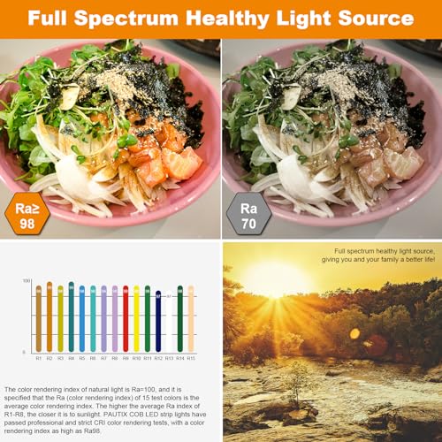 【Lead-free Materials & UL Listed】Designed with lead-free materials, PAUTIX COB LED strip lights are more environmentally friendly and protect your health than others. 24V low voltage no longer worry about electric shock, safer to use; low power consumption, energy saving. UL Listed, the quality is more trustworthy!