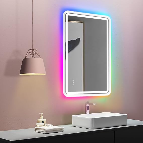 Specification: ANDY STAR 24”x32” LED Bathroom Mirror, Rounded Lighted Bathroom Mirror RGB Backlit and Front lit,Stepless Dimmable, Memory, Anti-Fog, Lighted Vanity Mirror Wall Mounted White Metal Frame