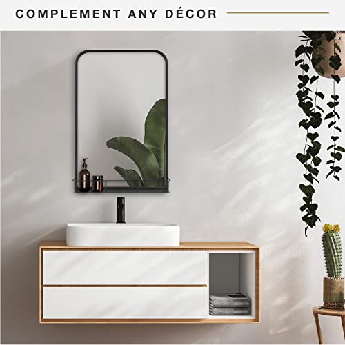 Modern Decor: The Multifunction large mirror features a minimalist design with a shelf for added storage and display space; The durable and classic matte black finish of this metal accent mirror with shelf works with all décor styles