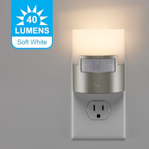 Specification: GE LED Motion Sensor Night Light, Plug into wall, 40 Lumens, Soft White, UL-Certified, Energy Efficient, Ideal Nightlight for Bedroom, Bathroom, Kitchen, Hallway, 29844, Silver, 1 Pack
