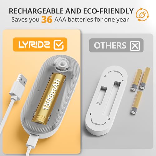 1500mAh Rechargeable Battery: Lyridz motion sensor closet lights has a built-in 1500mAh customized rechargeable lithium battery, which can satisfy 120 days of day by day use in fully charged state, and only must be recharged 3 times a year. (Lab test parameter settings: K1: 50% brightness. K2: 8 times a day. K3: 30 seconds Each and every time.)
