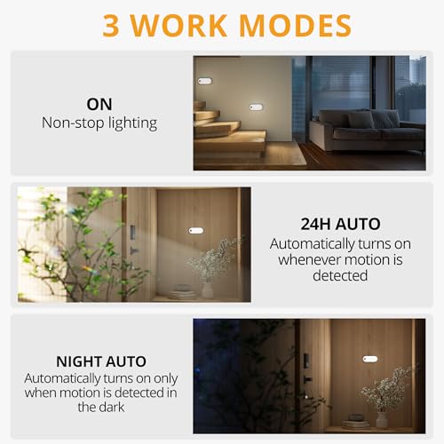 Three Modes: This smart motion sensor light indoor designed with 3 modes, namely ON(Non-Stop Lighting), NIGHT-AUTO(Automaticly turns on only when motion is detected at the hours of darkness) and 24H- AUTO(Automatically turns on every time motion is detected); Meet your individual needs for middle of the night lighting
