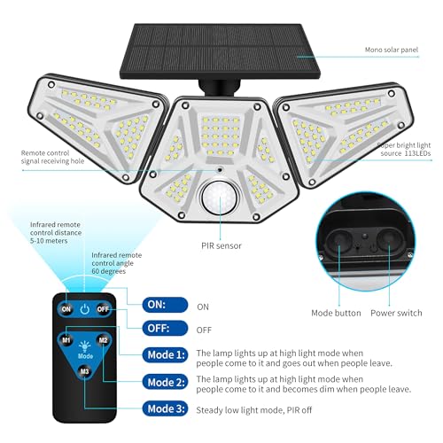 Specification: Solar Lights Outdoor, 2500LM 113 LED IP65 Waterproof Security Lights with Remote Control, 3 Heads Motion Sensor Lights, 270° Wide Angle Flood Wall Lights with 3 Modes(4 Packs)