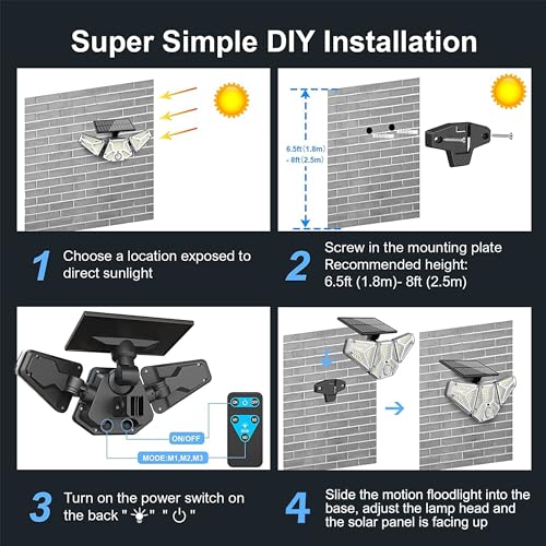 【Remote keep an eye on Solar Powered Floodlight】Each solar motion sensor lights is equipped with a wireless remote keep an eye on. The infrared remote keep an eye on range is 5-10 meters and the angle is 60 degrees. With the wireless remote keep an eye on, you’ll be able to select the most appropriate mode faster and more portable. Different lighting methods meet your daily needs. The three lighting modes are ① strong light sensor mode ② low light sensor mode ③ strong light mode.