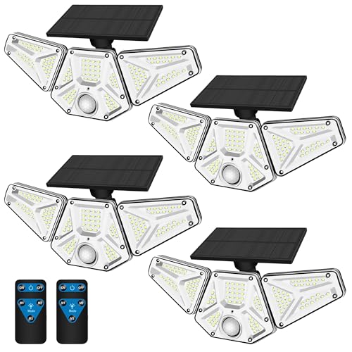 Solar Lights Outdoor, 2500LM 113 LED IP65 Waterproof Security Lights with Remote Control, 3 Heads Motion Sensor Lights, 270° Wide Angle Flood Wall Lights with 3 Modes(4 Packs)