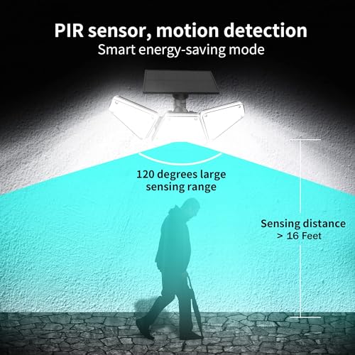 【Wide Angle Lighting and PIR Motion Sensor】The new creative shape of the solar floodlight, with 3 adjustable LED heads and multi angle lighting, each head can rotate independently to adjust the lighting angle and direction. The illumination angle can reach 270 °. The solar outdoor lights is equipped with an upgraded digital infrared motion sensor, which can detect the automatic lighting of moving objects through the PIR motion sensor system.