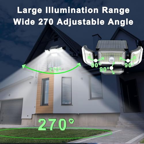 Expansive Illumination Coverage: With its innovative 4-head design, our solar-powered wall light offers an expansive 270° lighting angle, illuminating a wide area of up to 1600 square feet. Easily adjust every light head to more than a few angles, ensuring optimal coverage and prolonged illumination duration tailored to your specific requirements.