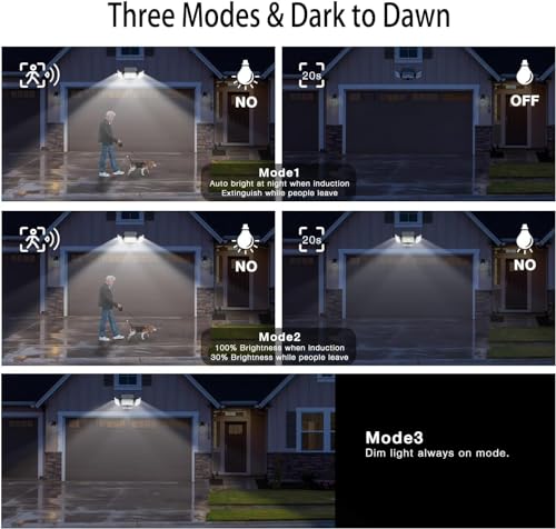 Versatile Lighting Modes with Motion Sensor: Our outside lights offer three distinct lighting modes tailored to diverse needs: a.At night, the light maintains a steady 30% brightness, automatically dimming at Crack of dawn. It can sustain full power illumination for over 12 hours. b.Upon detecting darkness, it adjusts to 10% brightness, brightening to full capacity when motion is sensed within 5-8 meters, and dimming back to 10% after 20 seconds of inactiveness. c.In darkness, motion within 5-8 meters triggers the light to remove darkness from at full 100% brightness, extinguishing 20 seconds after the area is vacated.
