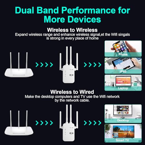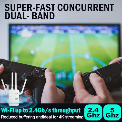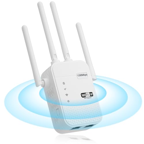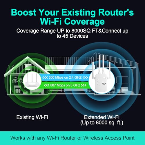 【Extend WiFi Coverage】Dual band WiFi extender boosts your WiFi coverage up to 12805 Sq.ft with 300Mbps on 2.4GHz and 1200Mbps on 5GHz. Get this wifi booster and signal amplifier to eliminate WiFi dead zones and provide more reliable WiFi. Enjoy HD streaming and smooth gaming experiences anywhere indoors and outdoors