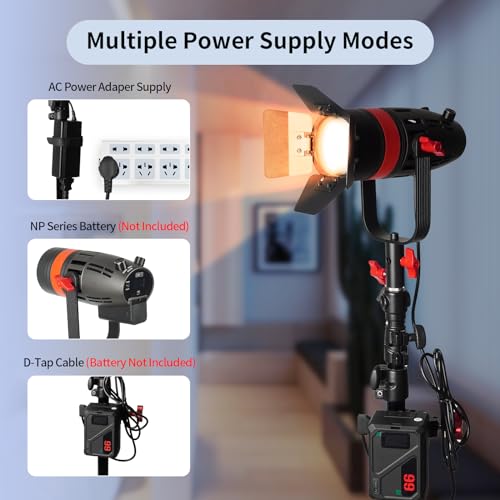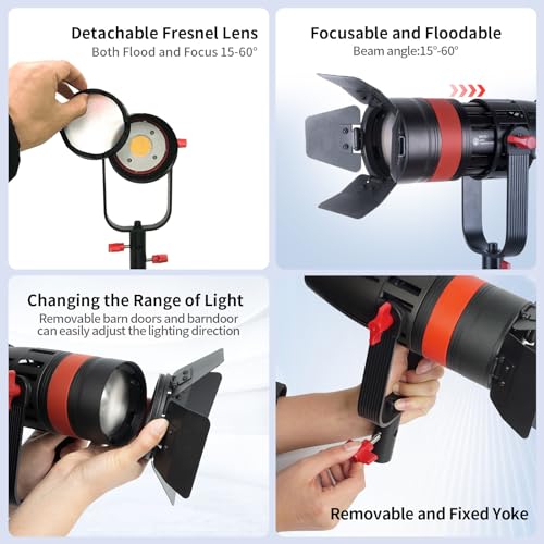 【Design Highlights】Photography lighting with built-in fan includes an adjustable Fresnel lens to lend a hand focal point the light and provide a longer throw. Barn doors allow relatively precise keep watch over over the form and spread of the LED light. Built-in fan radiates heat without interfering with the sound recording (barely audible at a distance of 1 meter)