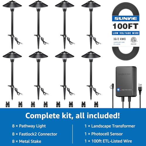 Specification: SUNVIE All-in-One LED Pathway Lighting Kit, 8-Pack Low Voltage Landscape Lights with Transformer and 100FT 16/2 AWG Wire, 3000K Waterproof Landscape Lighting with Connectors for Walkway Garden Yard