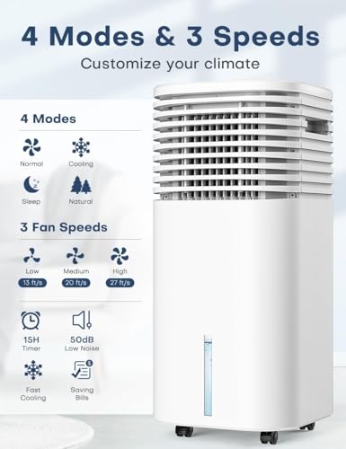 Specification: 4-IN-1 Portable Air Conditioners, Evaporative Air Cooler w/4 Modes & 3 Speeds, 15H Timer for Smart Auto-off, 2-Gal Tank for 20H Cooling,17FT Remote,No Hose Needed,120°Oscillating Swamp Cooler