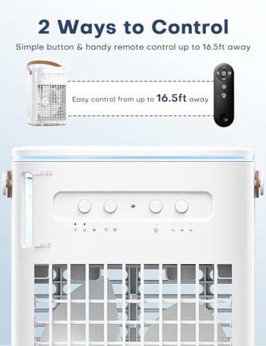 📱【𝐑𝐞𝐦𝐨𝐭𝐞 𝐂𝐨𝐧𝐭𝐫𝐨𝐥 & 𝐓𝐨𝐩 𝐁𝐮𝐭𝐭𝐨𝐧】With a 16.5 ft remote range, our small air conditioner offers the ultimate convenience. Effortlessly control your portable mini air cooler from the cozy confines of your sofa, bed, or anywhere in the room, easily adjusting your desired fan speed, mist level, lighting color, and timer. Bid farewell to inconvenience – no more getting up or reaching.