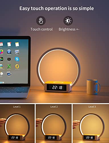 Amouhom Table Lamp, 18W Touch Lamp Alarm Clock with Wireless Charging Wake-Up Light, Digital Sonic 10W Max Qi Charger Nightstand Reading Lamps for Bedside, Reading, Home, Office