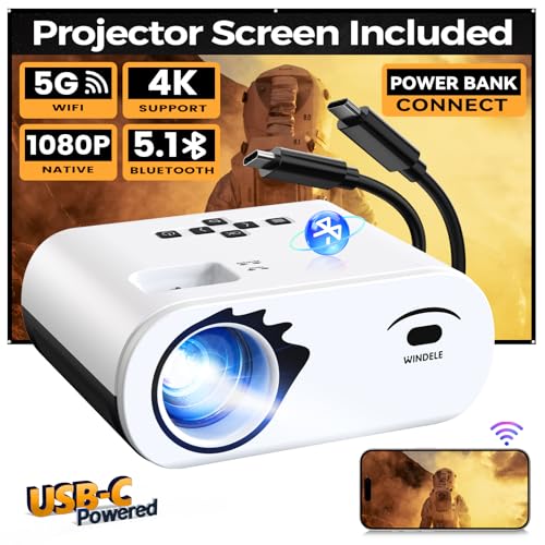 Specification: Upgraded 5G WiFi Bluetooth Projector, M8 Native 1080P Video Projector with USB-C Power Bank Compatibility, Portable Outdoor Projector with 84″ Screen, Home Theater Mini Projector, Black& White