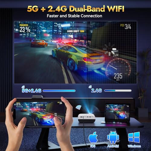 【5G WiFi &Multimedia Compatibility】The video projector is equipped with 2.4G& 5G WiFi connection technology offering you a much smoother and lag-free video-watching experience. It is built-in HDMI, AV, USB and 3.5mm headphone port, compatible with TV stick/box, PS3/4/5, PC, smartphone, tablet, laptop. NOTE: When using M8 for the first time, connect to WIFI with the included remote control.