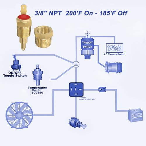 3/8″ NPT 185’F On – 170’F Off : STZJAYE electric fan thermostat temperature switch thread size: 3/8″ NPT. Fan ON Temperature Fahrenheit: 185 Degree, Fan OFF Temperature Fahrenheit: 170 Degree. Perfect fit for any of 10, 12, 14, and 16 inch fans, including dual fans.