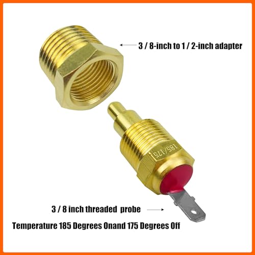 This electric cooling fan thermostat kit comes with everything you need, includes 40A relay, wiring harness, thermostat switch, 3/8 inch to 1/2 inch adapter, inline fuse holder, 2 20amp fuse, 1 spade connector for the temp sensor, 8 ring terminals, and 4 wire connectors. Temperature switch turns on fan approximately at 185 Degrees and Off at 175 Degrees.
