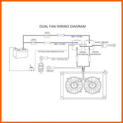 For dual fan wiring, you would need two of this relay kit. Easy to follow wiring diagram simplify wiring your electric fans. RED to 12VDC positive battery terminal, COFFEE to Fan Positive, BLACK to Ignition, GREY to Sending Unit per wiring diagram. Direct replacement part fits 10, 12, 14, and 16 inch cooling fans.