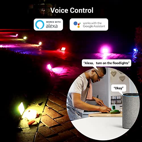 Smart Keep an eye on: Keep an eye on your outdoor flood lights from anywhere with WiFi smart app Keep an eye on via Smart Life APP. Set your lights to automatically turn on/off with smart schedules that work around your daily routine. The memory function is also applicable to them. The colored spotlights work with Alexa & Google Assistant, so you’ll easily turn your lights on and off, brighten or dim them, and change colors with voice commands. (Only works with 2.4Ghz WiFi)