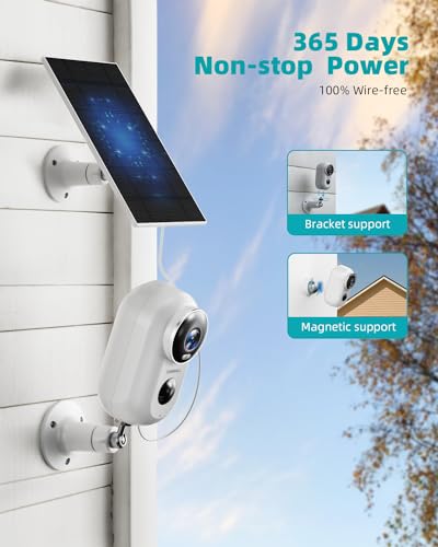 2024 Updated! No Drilling! Magnetic Mount: The solar security cameras wireless outdoor now includes a magnetic mount for easy, no-drill installation—perfect for bedrooms, front doors, yards, or garages. The design blends with any decor, making it ideal for indoor use without damaging walls. (Magnetic stand included)