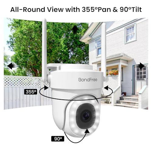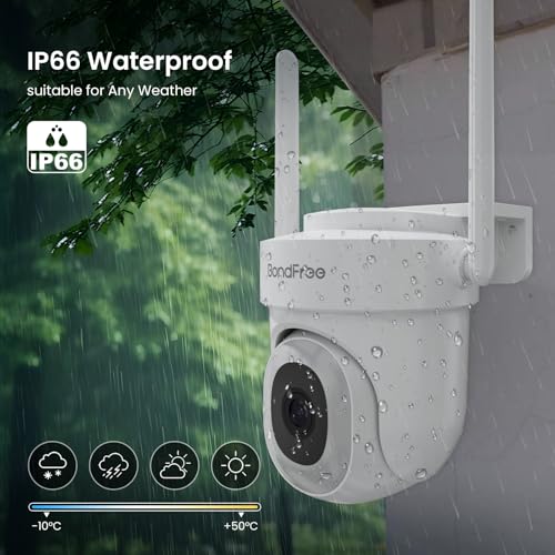 【IP66 Waterproof & 355°View Pan/90°Tilt】 Experience ultimate durability with the Bondfree security camera,equipped with an impressive IP66 waterproof rating.ensures resilience against quite a lot of environmental conditions, .coupled with the flexibility of a 90-degree up-and-down and 355-degree left-and-right rotation for comprehensive monitoring.Out of doors wifi camera providing reliable protection in your surveillance needs.